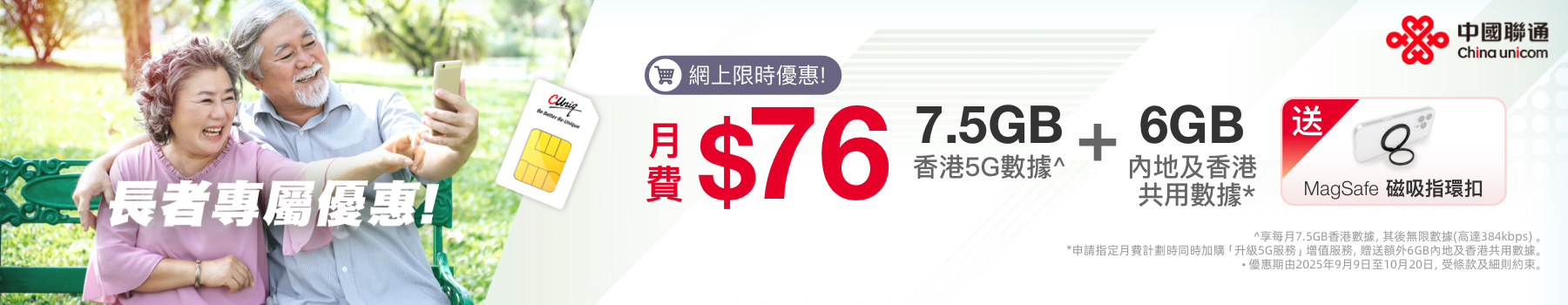 - 由2025年9月9日10:00至10月20日,經本網站新上台成功簽訂固定合約期24個月「4G本地數據無憂計劃(長者優惠)」同時加購「升級5G服務」增值服務,「升級5G服務」增值服務可享合約期內優惠月費$38(原月費$58),合約期內升級5G及享每月6GB內地及香港共用數據。